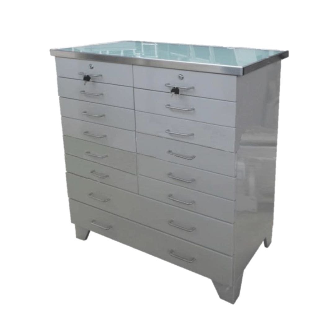 - Construido íntegramente con plancha de acero inoxidable de 0.8 m de espesor incluye 12 cajones de acero inoxidable dispuestos en una batería de dos hileras de 6 cajones cada uno, de 100 mm de altura y dos cajones de acero inoxidable que abarcan todo el largo del mueble de 150 mm de altura.
